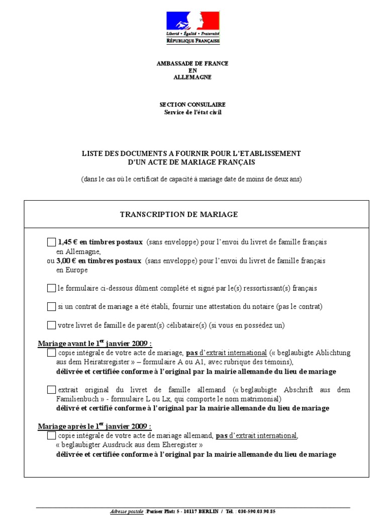 3) transcription d'un acte de mariage. La demande de transcription de votre mariage. Faites votre demande d'acte de mariage en ligne et recevez le directement chez vous. La transcription du mariage d'un français à l'étranger est indispensable pour qu'il y soit reconnu 11 rue de la maison blanche. J'ai regardé sur le net il y a un 08.